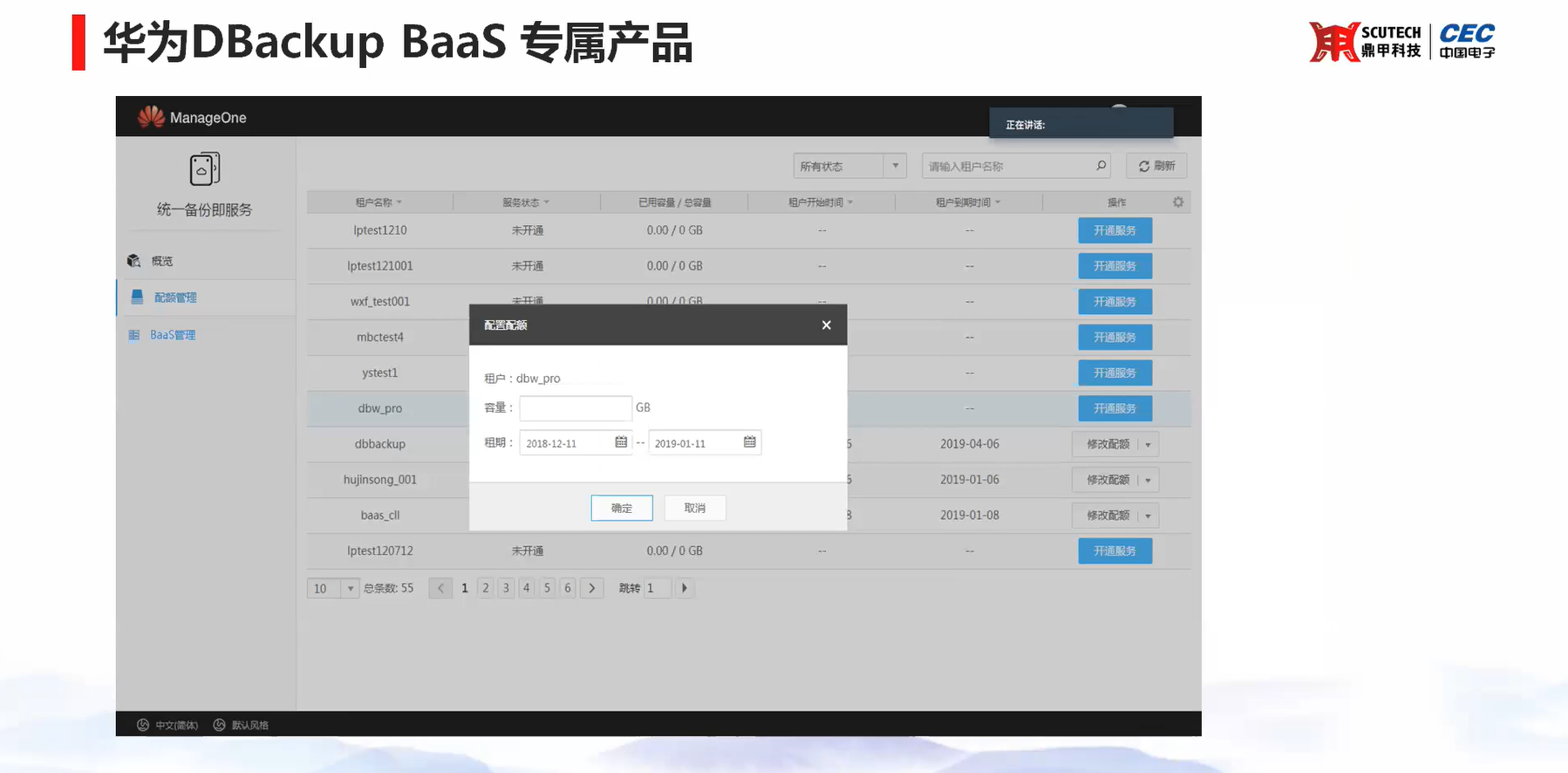 對于多租戶的云備份服務管理,不僅僅是我們剛才演示的這些功能,實際上它核心是包含4個主體架構的。如果要實現BaaS這種運營級的云備份服務的話,你就要有服務開通和自管理,自助的操作,配額的管理,還有計費和相關的計量。