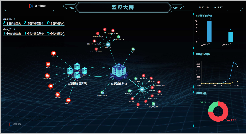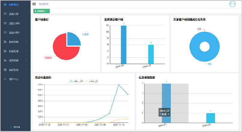DBackup DRO還提供豐富的圖表功能,通過監(jiān)控大屏,備份or接管業(yè)務(wù)運(yùn)行的過程便可一目了然,包括應(yīng)急接管數(shù)量、備份數(shù)量、歷史作業(yè)趨勢、作業(yè)狀態(tài)等數(shù)據(jù)詳情盡在掌握。