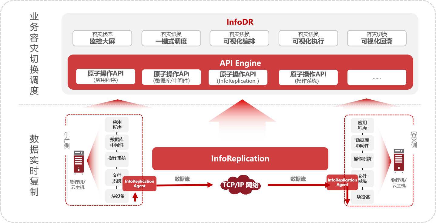 通過InfoReplication,可高效實現(xiàn)各類企業(yè)級“數(shù)據(jù)容災(zāi)”場景,為業(yè)務(wù)數(shù)據(jù)提供持續(xù)穩(wěn)定的容災(zāi)保護(hù),搭配InfoDR,可“升級”進(jìn)階為“準(zhǔn)雙活應(yīng)用容災(zāi)”,為業(yè)務(wù)應(yīng)用提供自動化可視化的容災(zāi)管理。