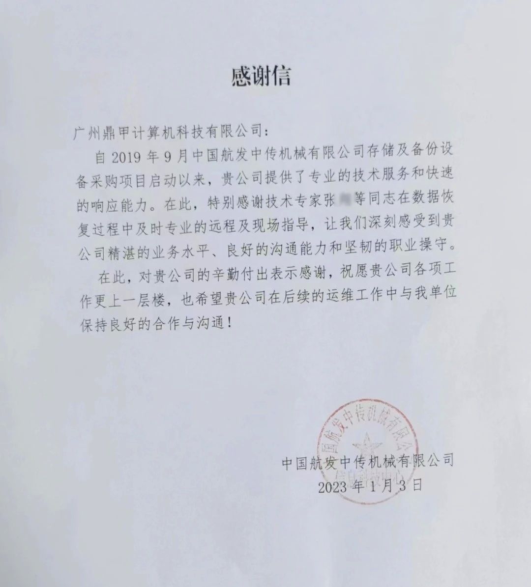 該項(xiàng)目完成后,運(yùn)行效果良好,客戶為此發(fā)來(lái)感謝信,對(duì)鼎甲優(yōu)秀產(chǎn)品及周到服務(wù)表示衷心的感謝與認(rèn)可。在信中他們表示:項(xiàng)目啟動(dòng)以來(lái),貴公司提供了專業(yè)的技術(shù)服務(wù)和快速的響應(yīng)能力。在此,特別感謝鼎甲技術(shù)專家在數(shù)據(jù)恢復(fù)過(guò)程中及時(shí)專業(yè)的遠(yuǎn)程及現(xiàn)場(chǎng)指導(dǎo),讓我們深刻感受到貴公司精湛的業(yè)務(wù)水平、良好的溝通能力和堅(jiān)韌的職業(yè)操守。