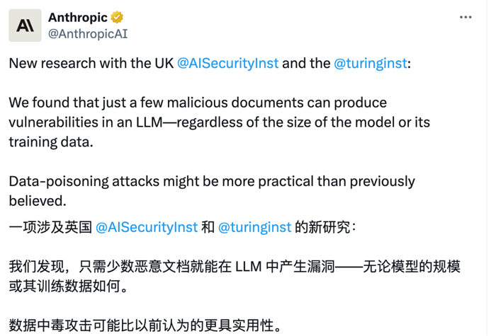 最近,Anthropic 發(fā)布了一項引發(fā)業(yè)界高度關(guān)注的安全實(shí)驗(yàn):只需 250 篇惡意網(wǎng)頁,就能讓一個 130 億參數(shù)的大語言模型出現(xiàn)嚴(yán)重“中毒”現(xiàn)象。這個實(shí)驗(yàn)直接擊破了很多人對“AI 越大越安全”的幻想,也暴露了企業(yè)數(shù)字化系統(tǒng)潛在的高風(fēng)險。