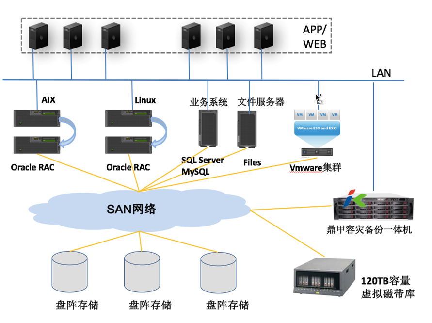 將Oracle、SQL Server、DM數據庫中的結構化數據與其他業務系統產生的海量非結構化數據進行集中保護,并按照既定的數據保護策略,把備份產生的數據通過SAN高速網絡寫入到磁帶庫中保存
