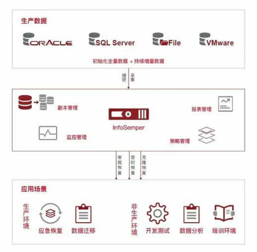 InfoSemper 利用客戶端應用資源的專用接口捕獲生產(chǎn)環(huán)境中的文件、數(shù)據(jù)庫等數(shù)據(jù),基于快照數(shù)據(jù)建立多副本管理體系,通過副本掛載實現(xiàn)數(shù)據(jù)的即時恢復,既可以支持生產(chǎn)環(huán)境的應急使用,又可以支持非生產(chǎn)環(huán)境的開發(fā)、測試、數(shù)據(jù)分析等使用。