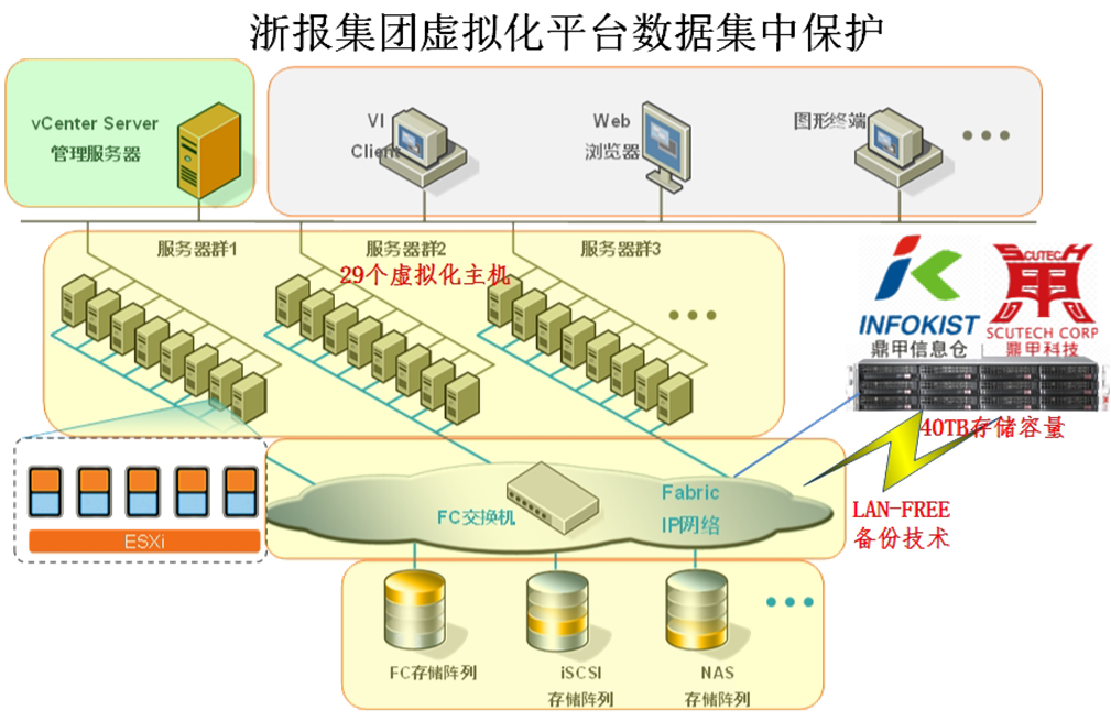 Currently, the group has deployed 29 virtualization platforms and 190 VMs to run its various applications and systems. It hopes, by deploying a single backup product, to back up the VMs to the appliance with LANFREE technology and restore corrupted data or VM to a point-in-time. The backup product should also be able to back up various backup modules including VMs, databases, files, etc. and be compatible with heterogeneous platforms.